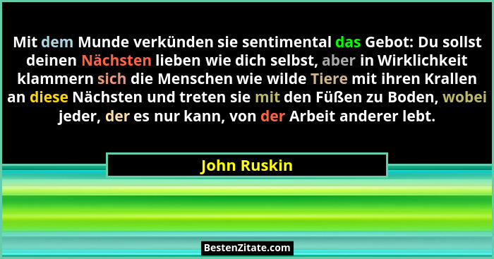 Mit dem Munde verkünden sie sentimental das Gebot: Du sollst deinen Nächsten lieben wie dich selbst, aber in Wirklichkeit klammern sich... - John Ruskin