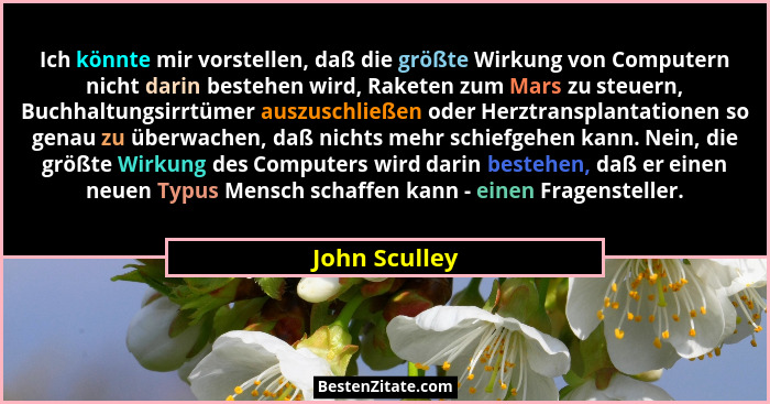 Ich könnte mir vorstellen, daß die größte Wirkung von Computern nicht darin bestehen wird, Raketen zum Mars zu steuern, Buchhaltungsirrtümer auszuschließen oder Herztransplantationen so genau zu überwachen, daß nichts mehr schiefgehen kann. Nein, die größte Wirkung des Computers wird darin bestehen, daß er einen neuen Typus Mensch schaffen kann - einen Fragensteller.