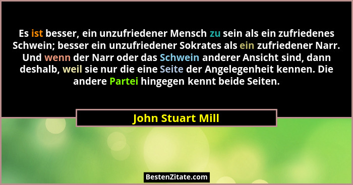 Es ist besser, ein unzufriedener Mensch zu sein als ein zufriedenes Schwein; besser ein unzufriedener Sokrates als ein zufriedener Narr. Und wenn der Narr oder das Schwein anderer Ansicht sind, dann deshalb, weil sie nur die eine Seite der Angelegenheit kennen. Die andere Partei hingegen kennt beide Seiten.