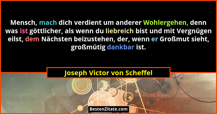 Mensch, mach dich verdient um anderer Wohlergehen, denn was ist göttlicher, als wenn du liebreich bist und mit Vergnügen eilst, dem Nächsten beizustehen, der, wenn er Großmut sieht, großmütig dankbar ist.
