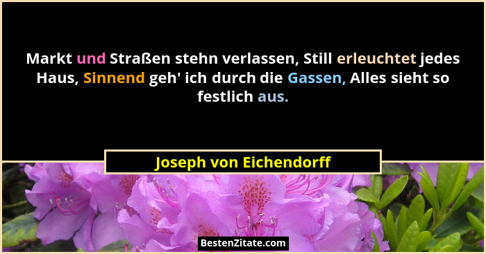 Markt und Straßen stehn verlassen, Still erleuchtet jedes Haus, Sinnend geh' ich durch die Gassen, Alles sieht so festlich aus.