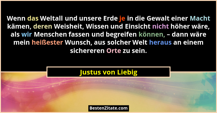 Wenn das Weltall und unsere Erde je in die Gewalt einer Macht kämen, deren Weisheit, Wissen und Einsicht nicht höher wäre, als wir Menschen fassen und begreifen können, – dann wäre mein heißester Wunsch, aus solcher Welt heraus an einem sichereren Orte zu sein.