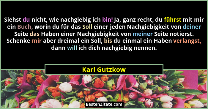Siehst du nicht, wie nachgiebig ich bin! Ja, ganz recht, du führst mit mir ein Buch, worin du für das Soll einer jeden Nachgiebigkeit von deiner Seite das Haben einer Nachgiebigkeit von meiner Seite notierst. Schenke mir aber dreimal ein Soll, bis du einmal ein Haben verlangst, dann will ich dich nachgiebig nennen.