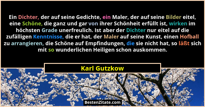 Ein Dichter, der auf seine Gedichte, ein Maler, der auf seine Bilder eitel, eine Schöne, die ganz und gar von ihrer Schönheit erfüllt ist, wirken im höchsten Grade unerfreulich. Ist aber der Dichter nur eitel auf die zufälligen Kenntnisse, die er hat, der Maler auf seine Kunst, einen Hofball zu arrangieren, die Schöne auf Empfindungen, die sie nicht hat, so läßt sich mit so wunderlichen Heiligen schon auskommen.