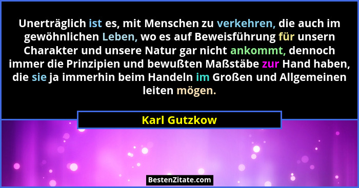 Unerträglich ist es, mit Menschen zu verkehren, die auch im gewöhnlichen Leben, wo es auf Beweisführung für unsern Charakter und unsere Natur gar nicht ankommt, dennoch immer die Prinzipien und bewußten Maßstäbe zur Hand haben, die sie ja immerhin beim Handeln im Großen und Allgemeinen leiten mögen.