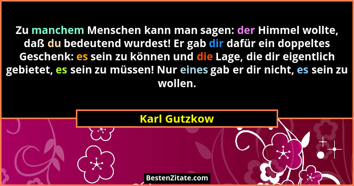 Zu manchem Menschen kann man sagen: der Himmel wollte, daß du bedeutend wurdest! Er gab dir dafür ein doppeltes Geschenk: es sein zu können und die Lage, die dir eigentlich gebietet, es sein zu müssen! Nur eines gab er dir nicht, es sein zu wollen.