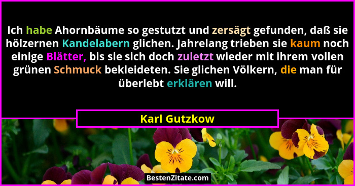Ich habe Ahornbäume so gestutzt und zersägt gefunden, daß sie hölzernen Kandelabern glichen. Jahrelang trieben sie kaum noch einige Blätter, bis sie sich doch zuletzt wieder mit ihrem vollen grünen Schmuck bekleideten. Sie glichen Völkern, die man für überlebt erklären will.