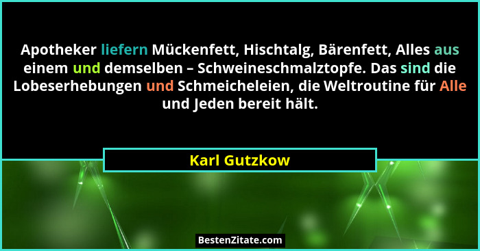 Apotheker liefern Mückenfett, Hischtalg, Bärenfett, Alles aus einem und demselben – Schweineschmalztopfe. Das sind die Lobeserhebungen und Schmeicheleien, die Weltroutine für Alle und Jeden bereit hält.