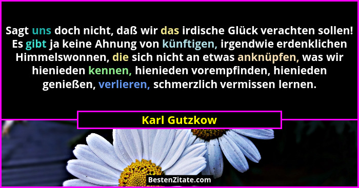 Sagt uns doch nicht, daß wir das irdische Glück verachten sollen! Es gibt ja keine Ahnung von künftigen, irgendwie erdenklichen Himmelswonnen, die sich nicht an etwas anknüpfen, was wir hienieden kennen, hienieden vorempfinden, hienieden genießen, verlieren, schmerzlich vermissen lernen.