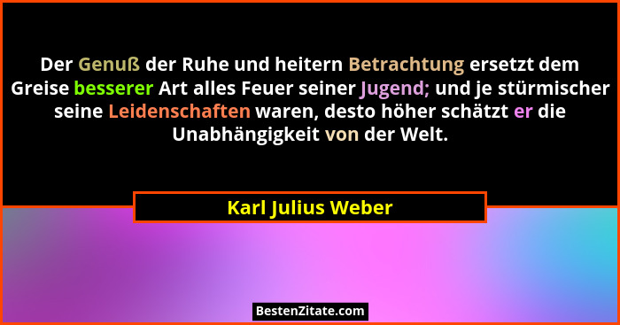 Der Genuß der Ruhe und heitern Betrachtung ersetzt dem Greise besserer Art alles Feuer seiner Jugend; und je stürmischer seine Leidenschaften waren, desto höher schätzt er die Unabhängigkeit von der Welt.