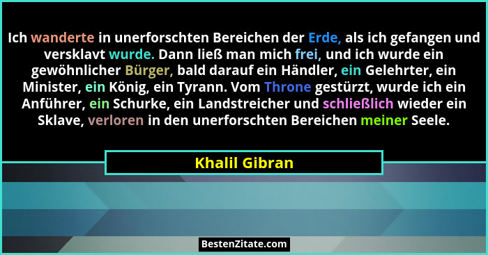 Ich wanderte in unerforschten Bereichen der Erde, als ich gefangen und versklavt wurde. Dann ließ man mich frei, und ich wurde ein gewöhnlicher Bürger, bald darauf ein Händler, ein Gelehrter, ein Minister, ein König, ein Tyrann. Vom Throne gestürzt, wurde ich ein Anführer, ein Schurke, ein Landstreicher und schließlich wieder ein Sklave, verloren in den unerforschten Bereichen meiner Seele.
