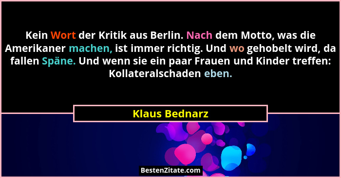 Kein Wort der Kritik aus Berlin. Nach dem Motto, was die Amerikaner machen, ist immer richtig. Und wo gehobelt wird, da fallen Späne. Und wenn sie ein paar Frauen und Kinder treffen: Kollateralschaden eben.
