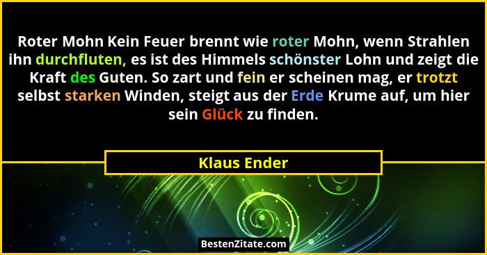 Roter Mohn Kein Feuer brennt wie roter Mohn, wenn Strahlen ihn durchfluten, es ist des Himmels schönster Lohn und zeigt die Kraft des Guten. So zart und fein er scheinen mag, er trotzt selbst starken Winden, steigt aus der Erde Krume auf, um hier sein Glück zu finden.