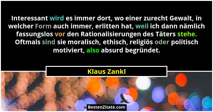 Interessant wird es immer dort, wo einer zurecht Gewalt, in welcher Form auch immer, erlitten hat, weil ich dann nämlich fassungslos vor den Rationalisierungen des Täters stehe. Oftmals sind sie moralisch, ethisch, religiös oder politisch motiviert, also absurd begründet.