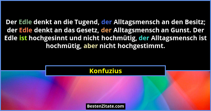 Der Edle denkt an die Tugend, der Alltagsmensch an den Besitz; der Edle denkt an das Gesetz, der Alltagsmensch an Gunst. Der Edle ist hochgesinnt und nicht hochmütig, der Alltagsmensch ist hochmütig, aber nicht hochgestimmt.