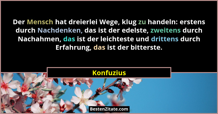 Der Mensch hat dreierlei Wege, klug zu handeln: erstens durch Nachdenken, das ist der edelste, zweitens durch Nachahmen, das ist der leichteste und drittens durch Erfahrung, das ist der bitterste.