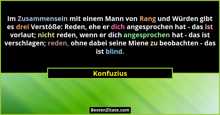 Im Zusammensein mit einem Mann von Rang und Würden gibt es drei Verstöße: Reden, ehe er dich angesprochen hat - das ist vorlaut; nicht reden, wenn er dich angesprochen hat - das ist verschlagen; reden, ohne dabei seine Miene zu beobachten - das ist blind.