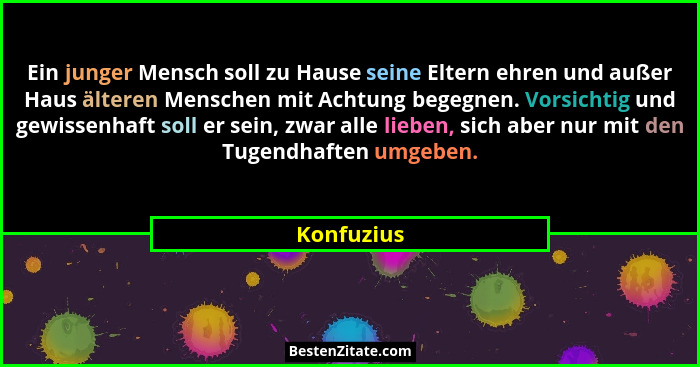 Ein junger Mensch soll zu Hause seine Eltern ehren und außer Haus älteren Menschen mit Achtung begegnen. Vorsichtig und gewissenhaft soll er sein, zwar alle lieben, sich aber nur mit den Tugendhaften umgeben.