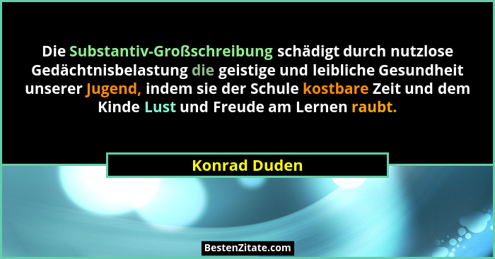 Die Substantiv-Großschreibung schädigt durch nutzlose Gedächtnisbelastung die geistige und leibliche Gesundheit unserer Jugend, indem sie der Schule kostbare Zeit und dem Kinde Lust und Freude am Lernen raubt.