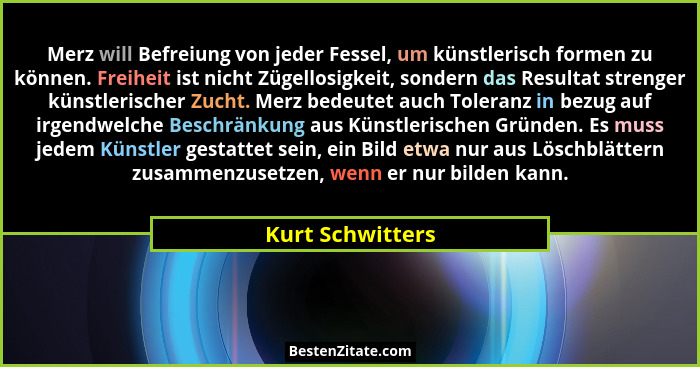 Merz will Befreiung von jeder Fessel, um künstlerisch formen zu können. Freiheit ist nicht Zügellosigkeit, sondern das Resultat strenger künstlerischer Zucht. Merz bedeutet auch Toleranz in bezug auf irgendwelche Beschränkung aus Künstlerischen Gründen. Es muss jedem Künstler gestattet sein, ein Bild etwa nur aus Löschblättern zusammenzusetzen, wenn er nur bilden kann.