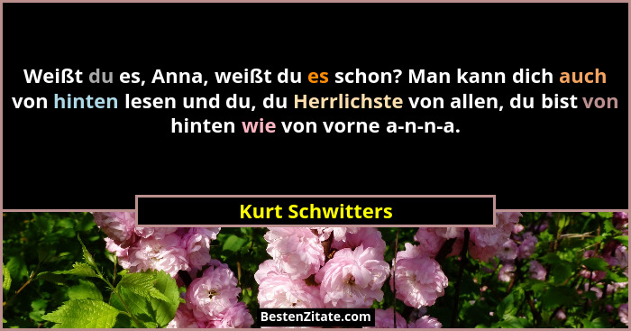 Weißt du es, Anna, weißt du es schon? Man kann dich auch von hinten lesen und du, du Herrlichste von allen, du bist von hinten wie von vorne a-n-n-a.