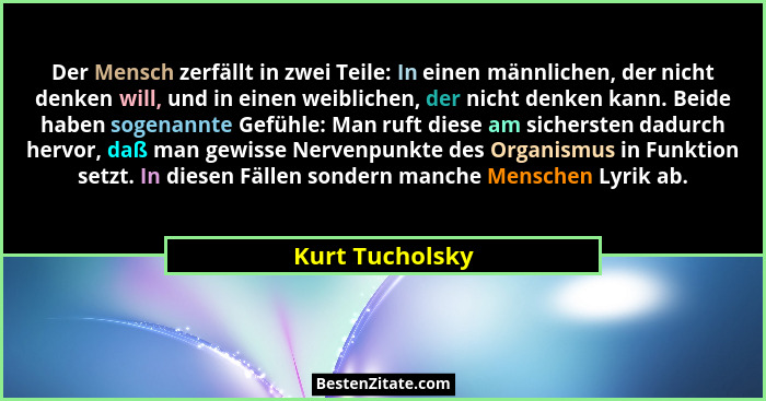 Der Mensch zerfällt in zwei Teile: In einen männlichen, der nicht denken will, und in einen weiblichen, der nicht denken kann. Beide haben sogenannte Gefühle: Man ruft diese am sichersten dadurch hervor, daß man gewisse Nervenpunkte des Organismus in Funktion setzt. In diesen Fällen sondern manche Menschen Lyrik ab.