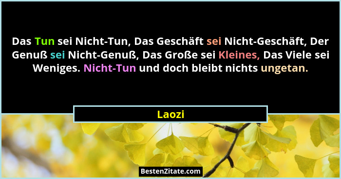 Das Tun sei Nicht-Tun, Das Geschäft sei Nicht-Geschäft, Der Genuß sei Nicht-Genuß, Das Große sei Kleines, Das Viele sei Weniges. Nicht-Tun und doch bleibt nichts ungetan.