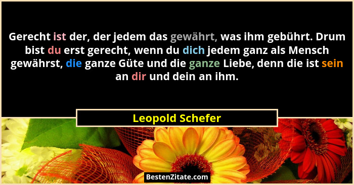 Gerecht ist der, der jedem das gewährt, was ihm gebührt. Drum bist du erst gerecht, wenn du dich jedem ganz als Mensch gewährst, die ganze Güte und die ganze Liebe, denn die ist sein an dir und dein an ihm.