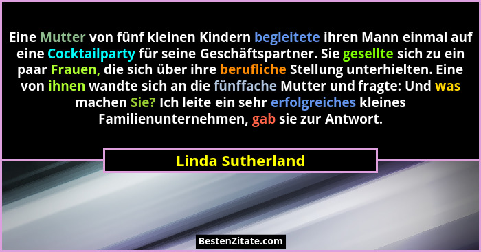 Eine Mutter von fünf kleinen Kindern begleitete ihren Mann einmal auf eine Cocktailparty für seine Geschäftspartner. Sie gesellte sich zu ein paar Frauen, die sich über ihre berufliche Stellung unterhielten. Eine von ihnen wandte sich an die fünffache Mutter und fragte: Und was machen Sie? Ich leite ein sehr erfolgreiches kleines Familienunternehmen, gab sie zur Antwort.