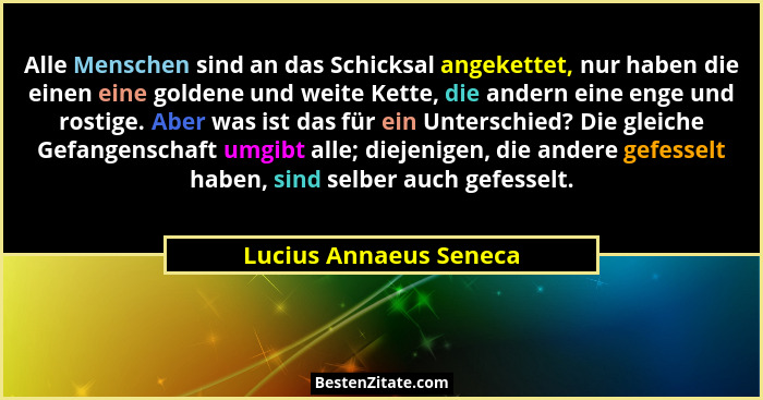 Alle Menschen sind an das Schicksal angekettet, nur haben die einen eine goldene und weite Kette, die andern eine enge und rostige. Aber was ist das für ein Unterschied? Die gleiche Gefangenschaft umgibt alle; diejenigen, die andere gefesselt haben, sind selber auch gefesselt.