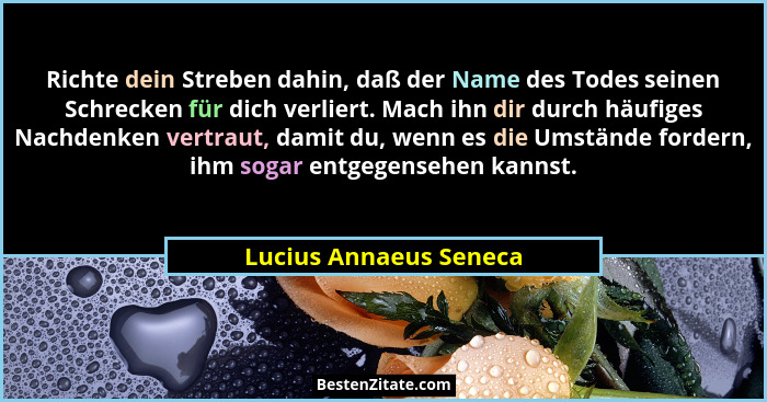 Richte dein Streben dahin, daß der Name des Todes seinen Schrecken für dich verliert. Mach ihn dir durch häufiges Nachdenken vertraut, damit du, wenn es die Umstände fordern, ihm sogar entgegensehen kannst.