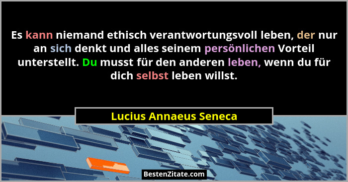 Es kann niemand ethisch verantwortungsvoll leben, der nur an sich denkt und alles seinem persönlichen Vorteil unterstellt. Du musst für den anderen leben, wenn du für dich selbst leben willst.