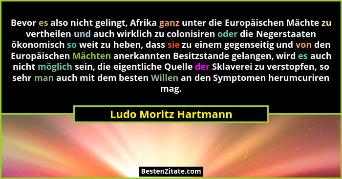 Bevor es also nicht gelingt, Afrika ganz unter die Europäischen Mächte zu vertheilen und auch wirklich zu colonisiren oder die Negerstaaten ökonomisch so weit zu heben, dass sie zu einem gegenseitig und von den Europäischen Mächten anerkannten Besitzstande gelangen, wird es auch nicht möglich sein, die eigentliche Quelle der Sklaverei zu verstopfen, so sehr man auch mit dem besten Willen an den Symptomen herumcuriren mag.