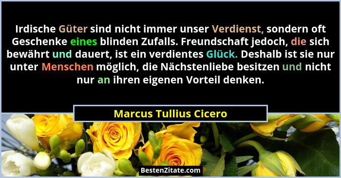 Irdische Güter sind nicht immer unser Verdienst, sondern oft Geschenke eines blinden Zufalls. Freundschaft jedoch, die sich bewährt und dauert, ist ein verdientes Glück. Deshalb ist sie nur unter Menschen möglich, die Nächstenliebe besitzen und nicht nur an ihren eigenen Vorteil denken.