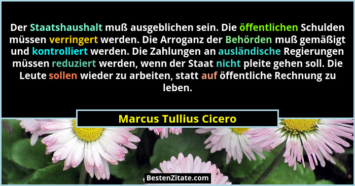 Der Staatshaushalt muß ausgeblichen sein. Die öffentlichen Schulden müssen verringert werden. Die Arroganz der Behörden muß gemäßigt und kontrolliert werden. Die Zahlungen an ausländische Regierungen müssen reduziert werden, wenn der Staat nicht pleite gehen soll. Die Leute sollen wieder zu arbeiten, statt auf öffentliche Rechnung zu leben.