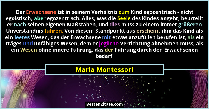 Der Erwachsene ist in seinem Verhältnis zum Kind egozentrisch - nicht egoistisch, aber egozentrisch. Alles, was die Seele des Kindes angeht, beurteilt er nach seinen eigenen Maßstäben, und dies muss zu einem immer größeren Unverständnis führen. Von diesem Standpunkt aus erscheint ihm das Kind als ein leeres Wesen, das der Erwachsene mit etwas anzufüllen berufen ist, als ein träges und unfähiges Wesen, dem er jegliche Verrichtung abnehmen muss, als ein Wesen ohne innere Führung, das der Führung durch den Erwachsenen bedarf.