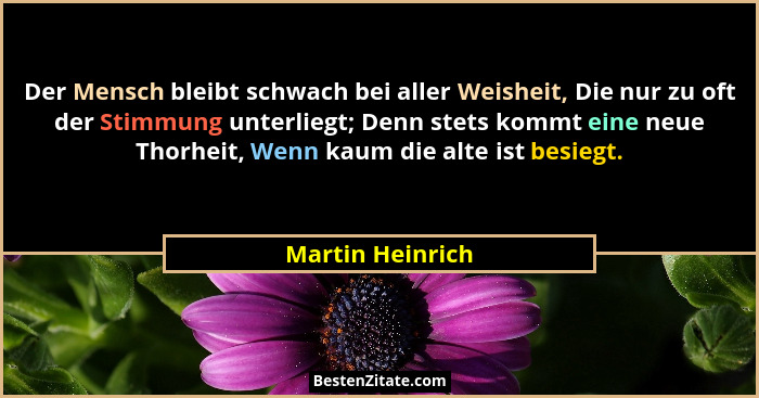 Der Mensch bleibt schwach bei aller Weisheit, Die nur zu oft der Stimmung unterliegt; Denn stets kommt eine neue Thorheit, Wenn kaum die alte ist besiegt.