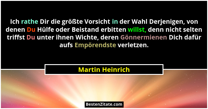 Ich rathe Dir die größte Vorsicht in der Wahl Derjenigen, von denen Du Hülfe oder Beistand erbitten willst, denn nicht selten triffst Du unter ihnen Wichte, deren Gönnermienen Dich dafür aufs Empörendste verletzen.