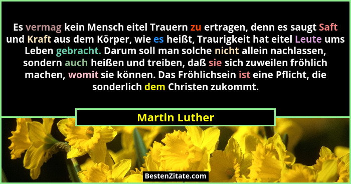 Es vermag kein Mensch eitel Trauern zu ertragen, denn es saugt Saft und Kraft aus dem Körper, wie es heißt, Traurigkeit hat eitel Leute ums Leben gebracht. Darum soll man solche nicht allein nachlassen, sondern auch heißen und treiben, daß sie sich zuweilen fröhlich machen, womit sie können. Das Fröhlichsein ist eine Pflicht, die sonderlich dem Christen zukommt.