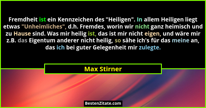 Fremdheit ist ein Kennzeichen des "Heiligen". In allem Heiligen liegt etwas "Unheimliches", d.h. Fremdes, worin wir nicht ganz heimisch und zu Hause sind. Was mir heilig ist, das ist mir nicht eigen, und wäre mir z.B. das Eigentum anderer nicht heilig, so sähe ich's für das meine an, das ich bei guter Gelegenheit mir zulegte.