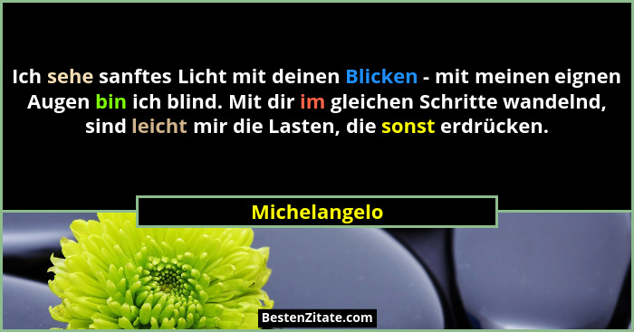 Ich sehe sanftes Licht mit deinen Blicken - mit meinen eignen Augen bin ich blind. Mit dir im gleichen Schritte wandelnd, sind leicht mir die Lasten, die sonst erdrücken.