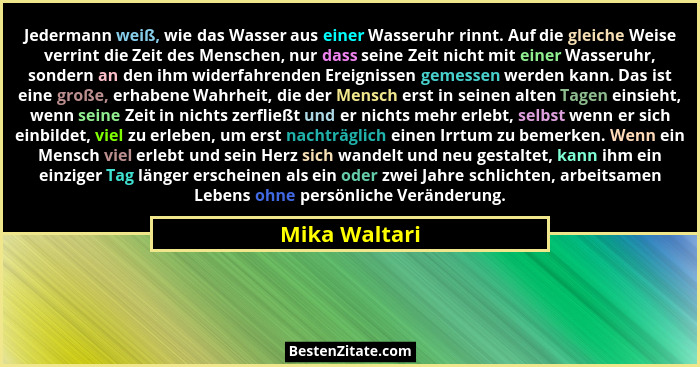 Jedermann weiß, wie das Wasser aus einer Wasseruhr rinnt. Auf die gleiche Weise verrint die Zeit des Menschen, nur dass seine Zeit nicht mit einer Wasseruhr, sondern an den ihm widerfahrenden Ereignissen gemessen werden kann. Das ist eine große, erhabene Wahrheit, die der Mensch erst in seinen alten Tagen einsieht, wenn seine Zeit in nichts zerfließt und er nichts mehr erlebt, selbst wenn er sich einbildet, viel zu erleben, um erst nachträglich einen Irrtum zu bemerken. Wenn ein Mensch viel erlebt und sein Herz sich wandelt und neu gestaltet, kann ihm ein einziger Tag länger erscheinen als ein oder zwei Jahre schlichten, arbeitsamen Lebens ohne persönliche Veränderung.