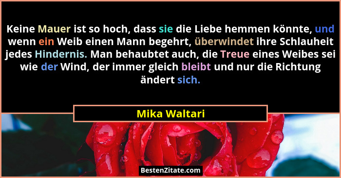 Keine Mauer ist so hoch, dass sie die Liebe hemmen könnte, und wenn ein Weib einen Mann begehrt, überwindet ihre Schlauheit jedes Hindernis. Man behaubtet auch, die Treue eines Weibes sei wie der Wind, der immer gleich bleibt und nur die Richtung ändert sich.