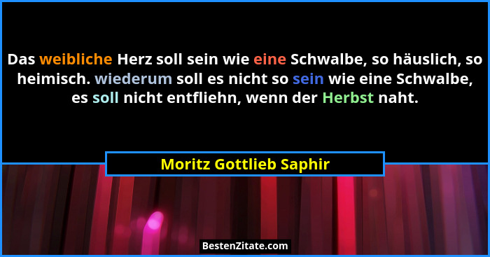 Das weibliche Herz soll sein wie eine Schwalbe, so häuslich, so heimisch. wiederum soll es nicht so sein wie eine Schwalbe, es soll nicht entfliehn, wenn der Herbst naht.