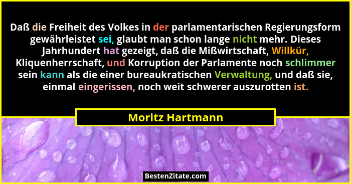 Daß die Freiheit des Volkes in der parlamentarischen Regierungsform gewährleistet sei, glaubt man schon lange nicht mehr. Dieses Jahrhundert hat gezeigt, daß die Mißwirtschaft, Willkür, Kliquenherrschaft, und Korruption der Parlamente noch schlimmer sein kann als die einer bureaukratischen Verwaltung, und daß sie, einmal eingerissen, noch weit schwerer auszurotten ist.