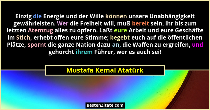 Einzig die Energie und der Wille können unsere Unabhängigkeit gewährleisten. Wer die Freiheit will, muß bereit sein, ihr bis zum letzten Atemzug alles zu opfern. Laßt eure Arbeit und eure Geschäfte im Stich, erhebt offen eure Stimme; begebt euch auf die öffentlichen Plätze, spornt die ganze Nation dazu an, die Waffen zu ergreifen, und gehorcht ihrem Führer, wer es auch sei!