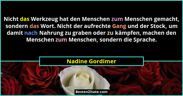 Nicht das Werkzeug hat den Menschen zum Menschen gemacht, sondern das Wort. Nicht der aufrechte Gang und der Stock, um damit nach Nahrung zu graben oder zu kämpfen, machen den Menschen zum Menschen, sondern die Sprache.