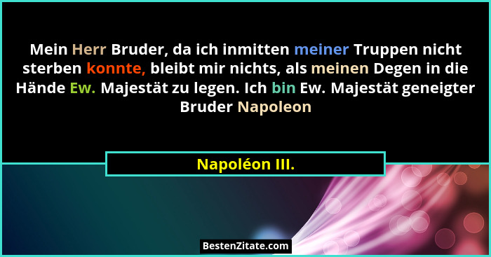Mein Herr Bruder, da ich inmitten meiner Truppen nicht sterben konnte, bleibt mir nichts, als meinen Degen in die Hände Ew. Majestät zu legen. Ich bin Ew. Majestät geneigter Bruder Napoleon