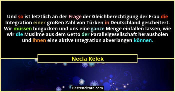 Und so ist letztlich an der Frage der Gleichberechtigung der Frau die Integration einer großen Zahl von Türken in Deutschland gescheitert. Wir müssen hingucken und uns eine ganze Menge einfallen lassen, wie wir die Muslime aus dem Getto der Parallelgesellschaft herausholen und ihnen eine aktive Integration abverlangen können.