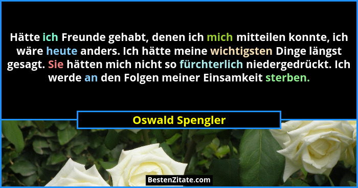 Hätte ich Freunde gehabt, denen ich mich mitteilen konnte, ich wäre heute anders. Ich hätte meine wichtigsten Dinge längst gesagt. Sie hätten mich nicht so fürchterlich niedergedrückt. Ich werde an den Folgen meiner Einsamkeit sterben.